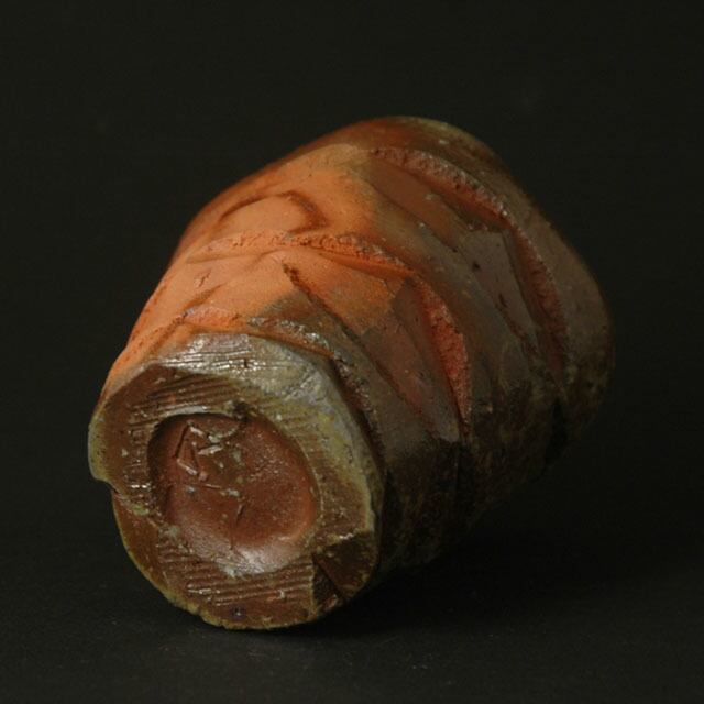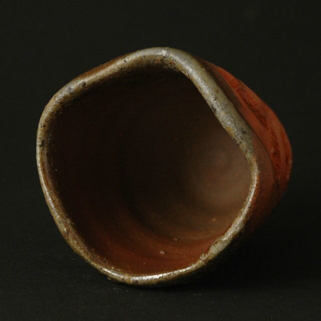 ボタ抜けが朱色を呈している窯変鎬酒呑(ぐい呑み)。