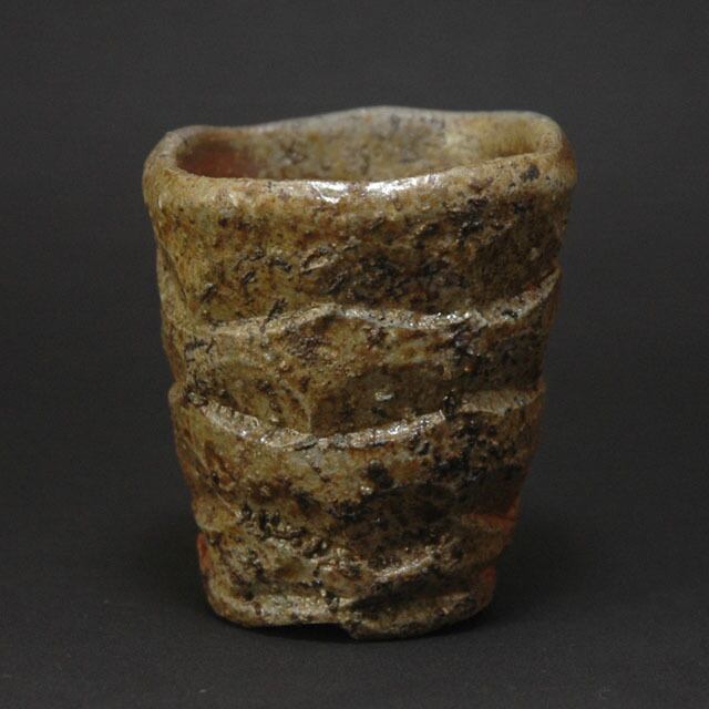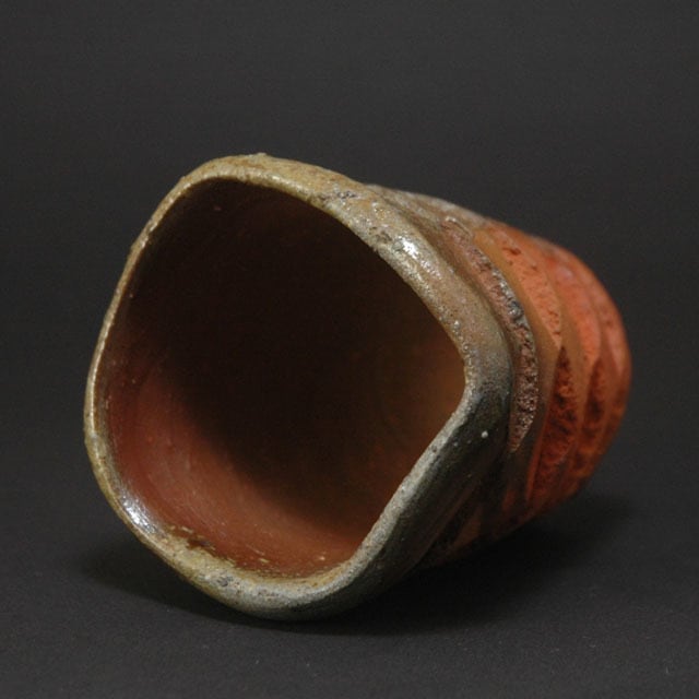 ボタ抜けが朱色を呈している窯変鎬酒呑(ぐい呑み)。