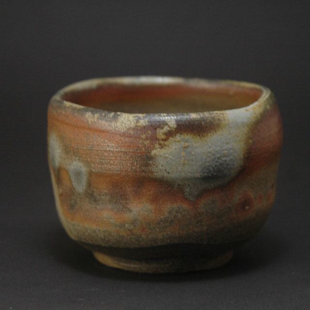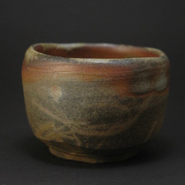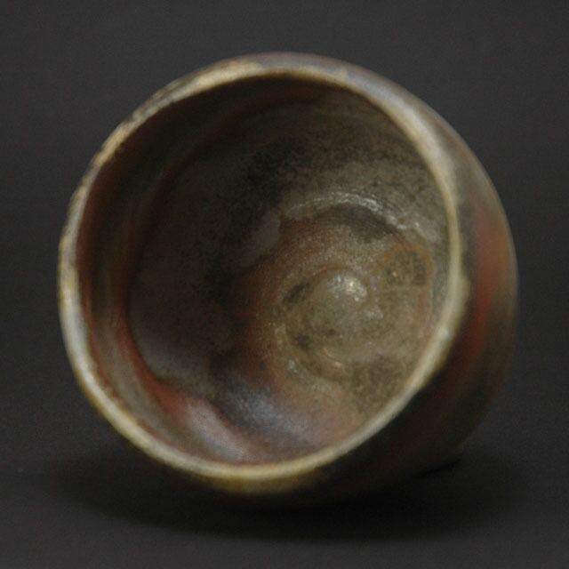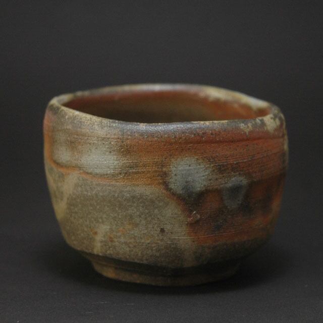 焼成の最終段階で作品の間に木炭を投入して景色を作る炭サンギリという窯変の大ぶりの酒呑。