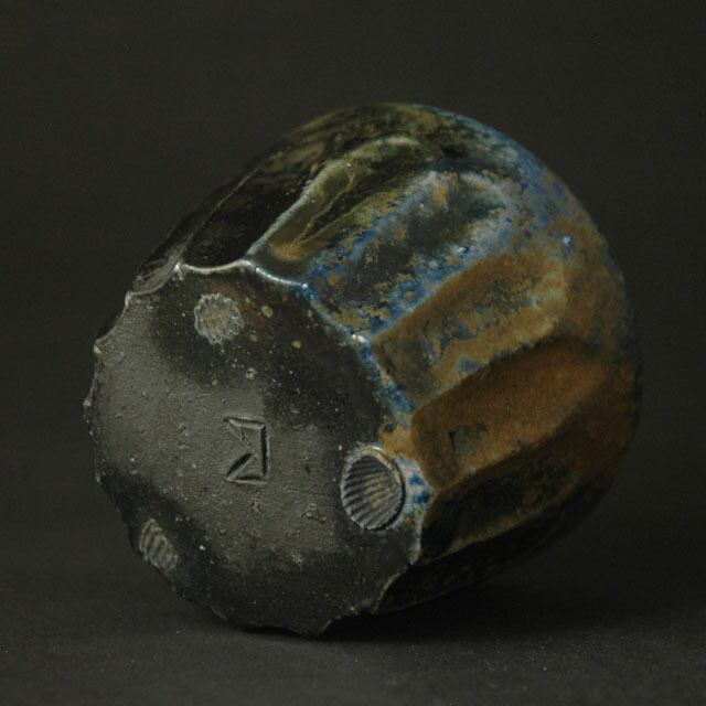 焼成前に、塗り土が施されています。塗土には、鉄・マンガン・コバルト等が含まれています。窯の一番正面で焼成されており、塗り土中のコバルトがブルーに発色しています。
