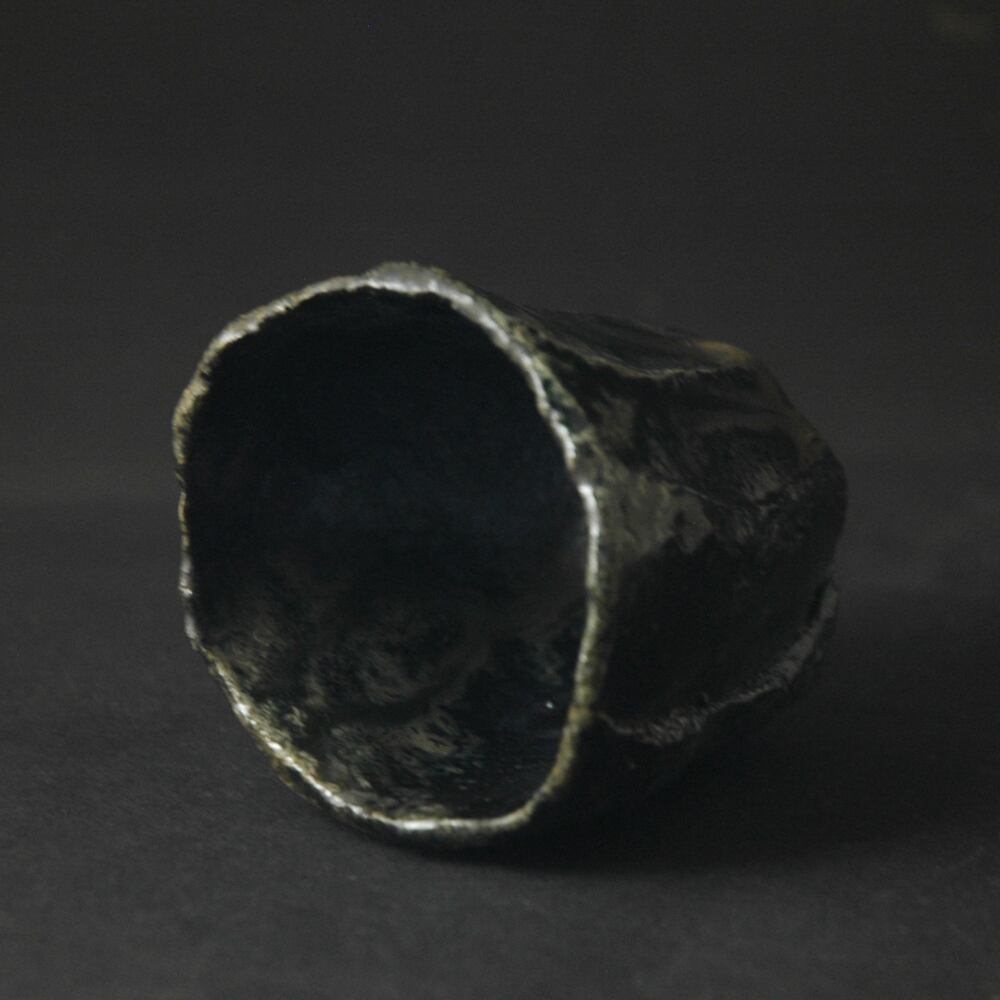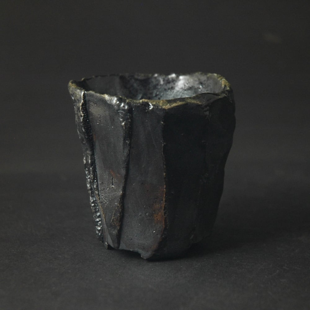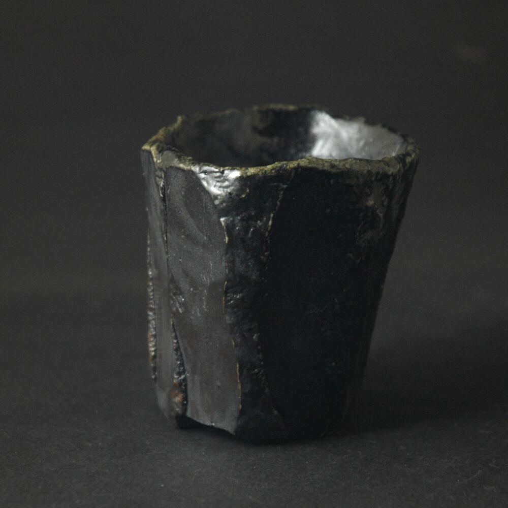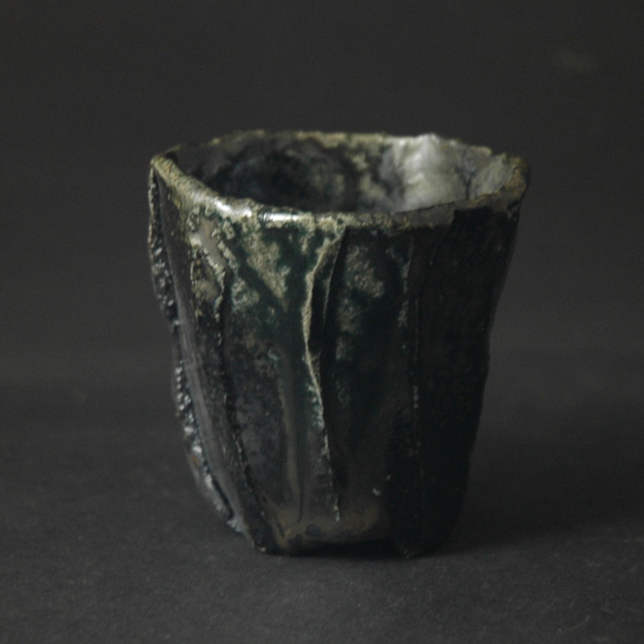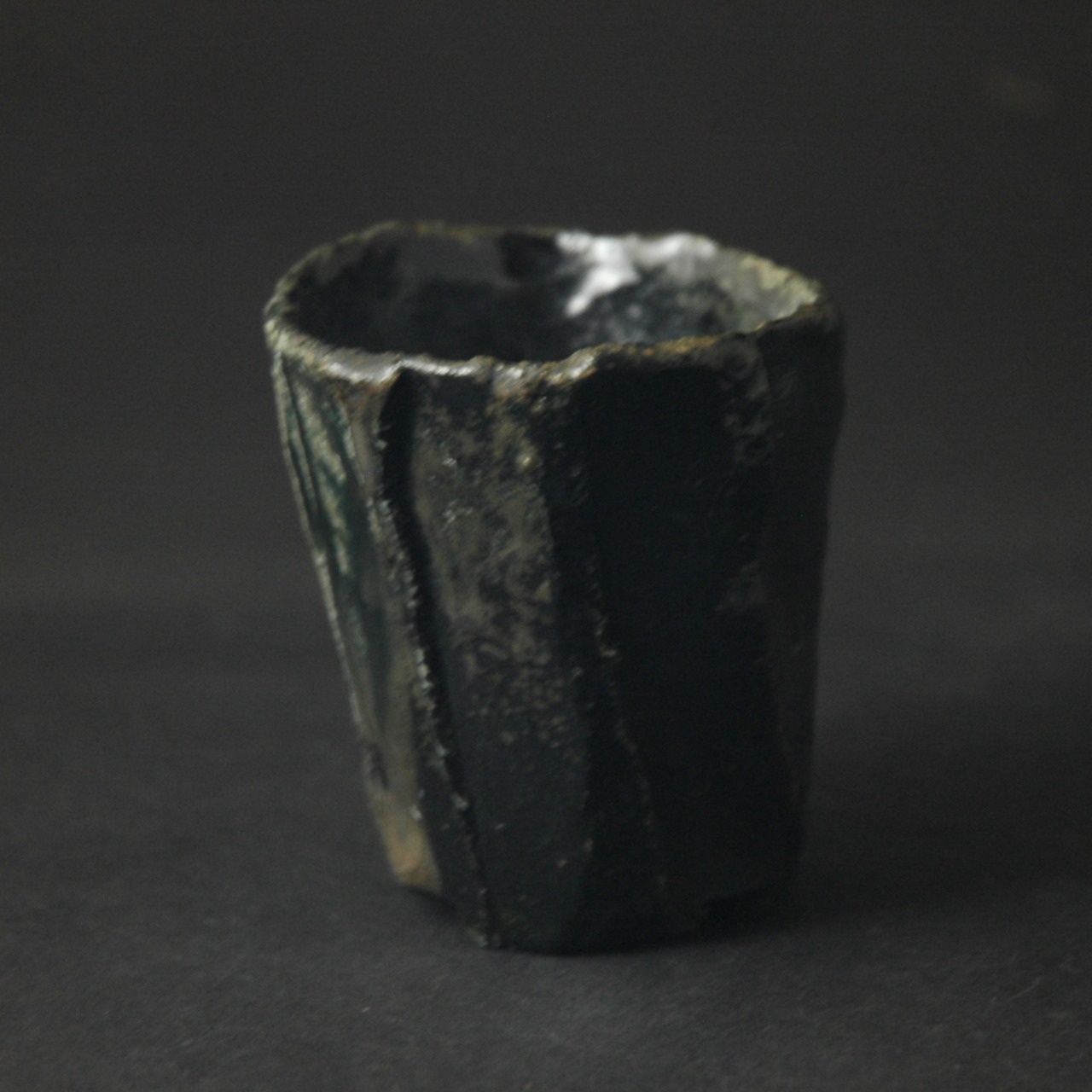 粘土を塊のまま成形し、表面をナイフで加飾した後、中を刳り貫いて作られた酒呑です。