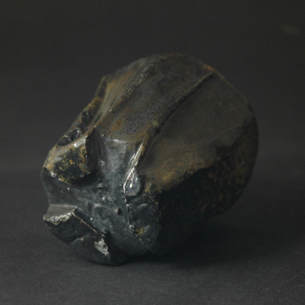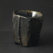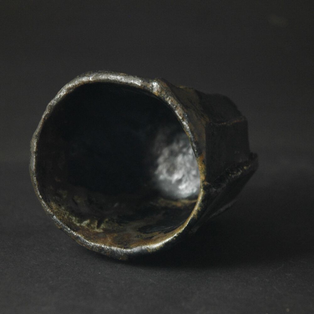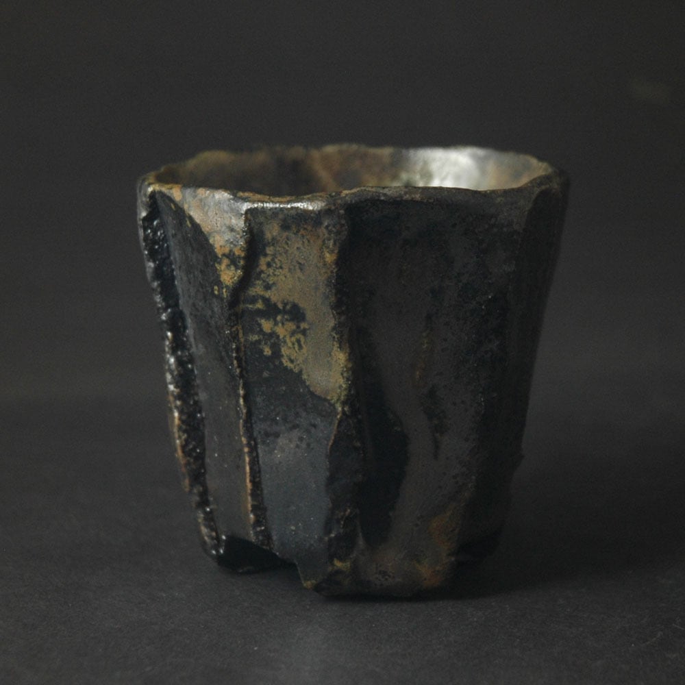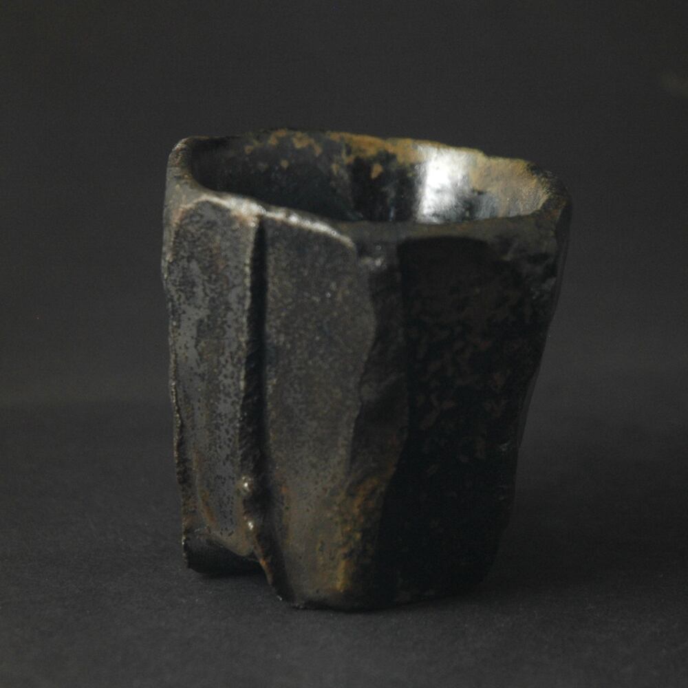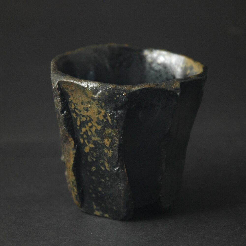 粘土を塊のまま成形し、表面をナイフで加飾した後、中を刳り貫いて作られた酒呑です。