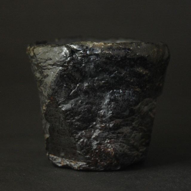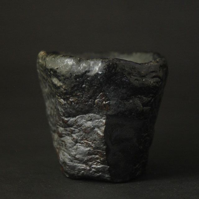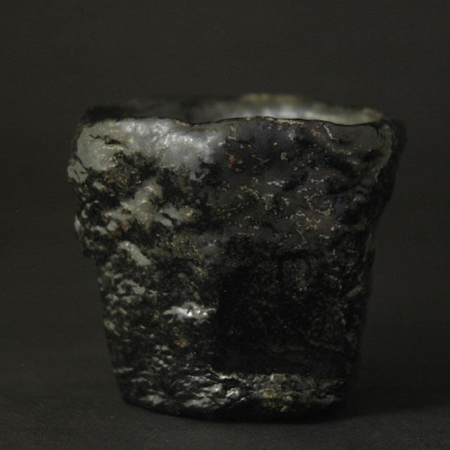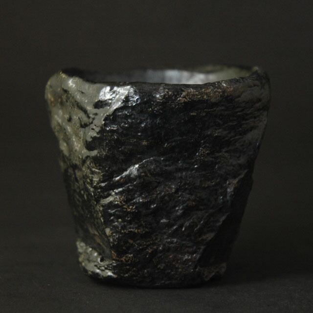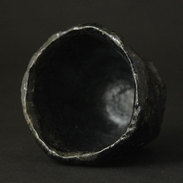 粘土を塊のまま成形し、表面をナイフで加飾した後、中を刳り貫いて作られた酒呑です。