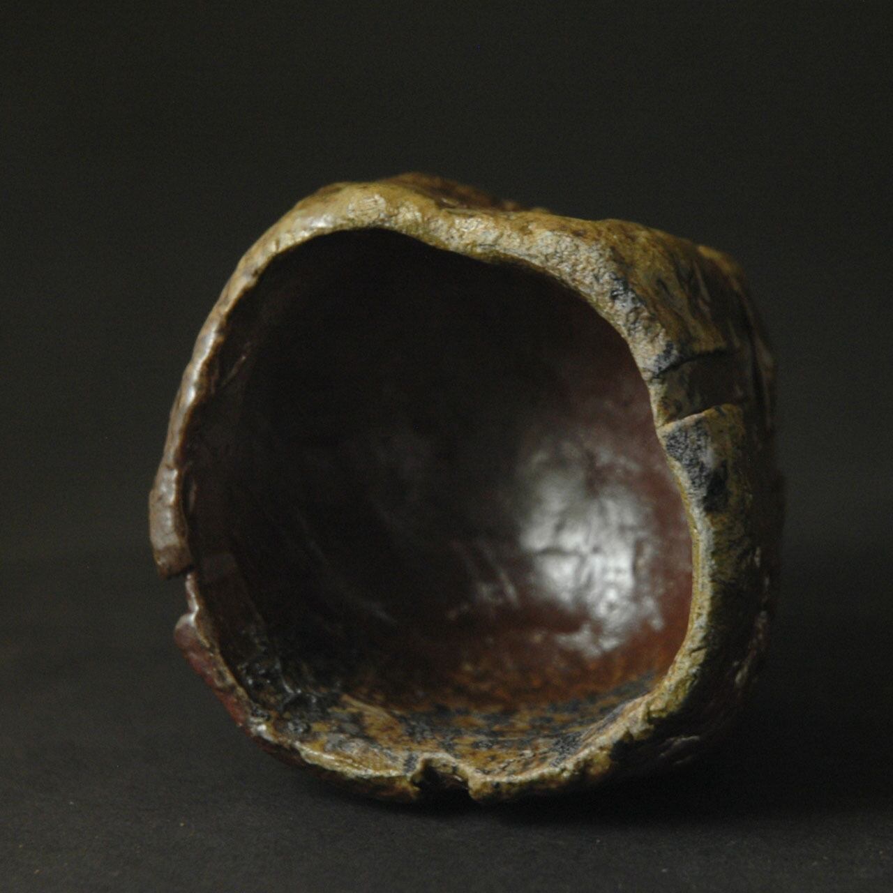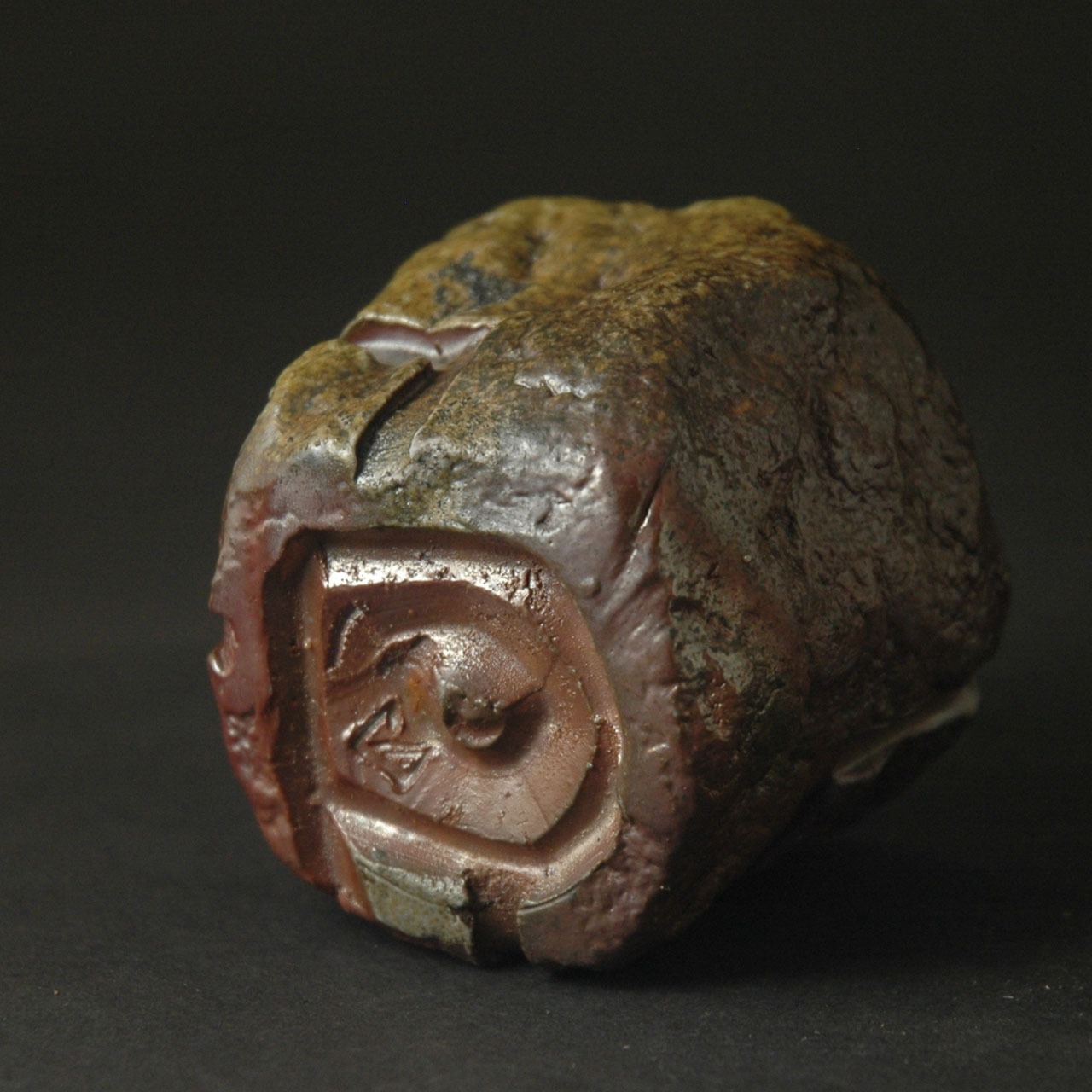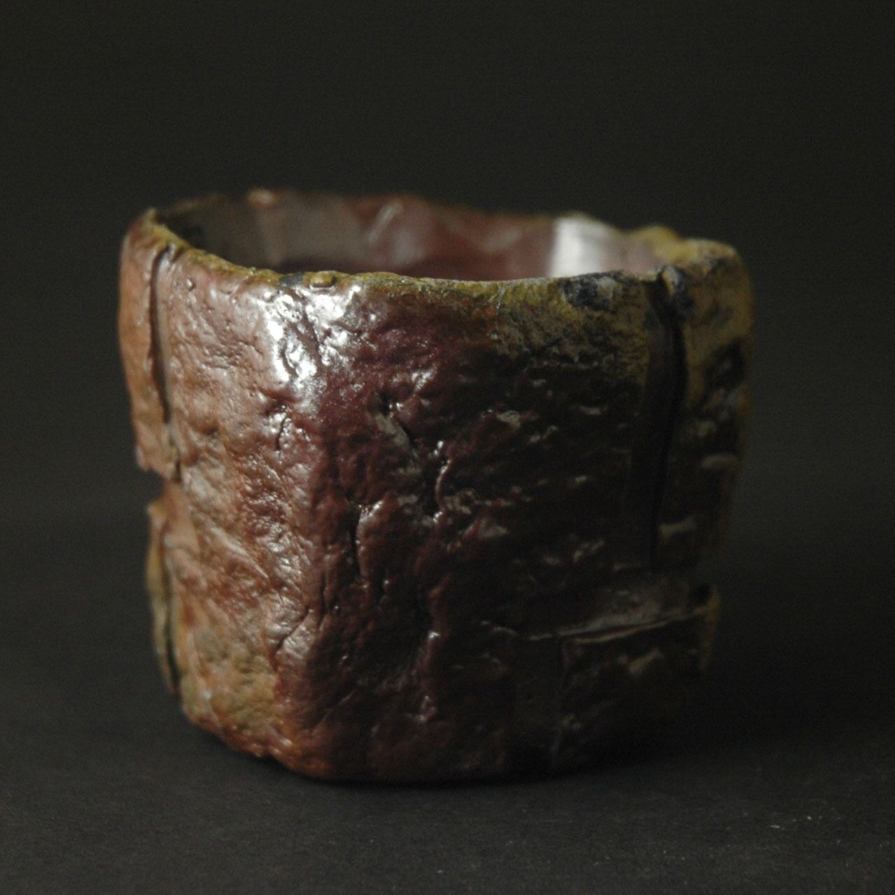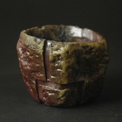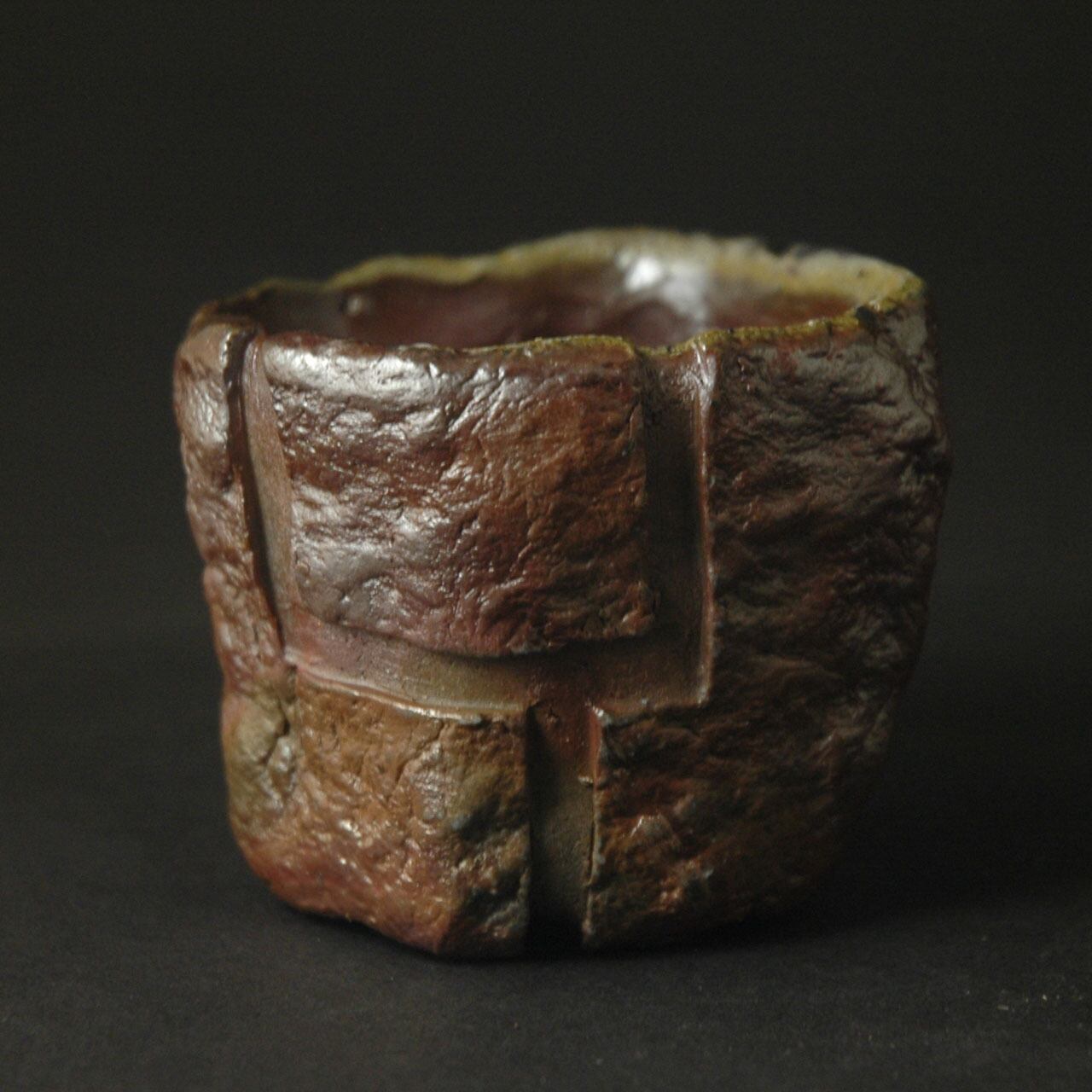 粘土を塊のまま成形し、表面を加飾した後、中を刳り貫いて作られた酒呑(ぐい呑み)です。