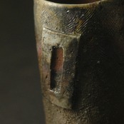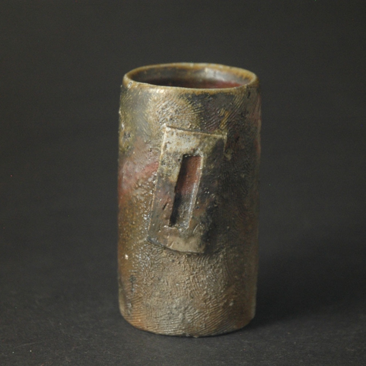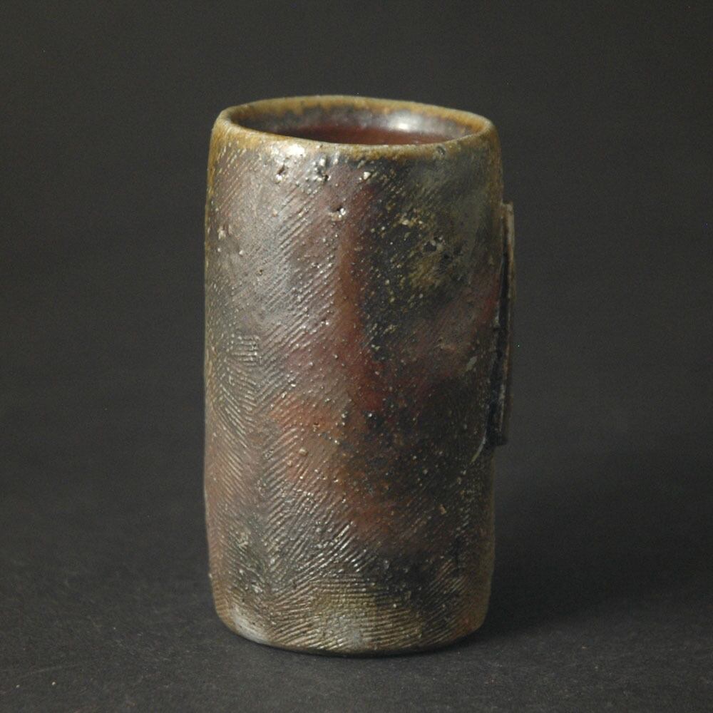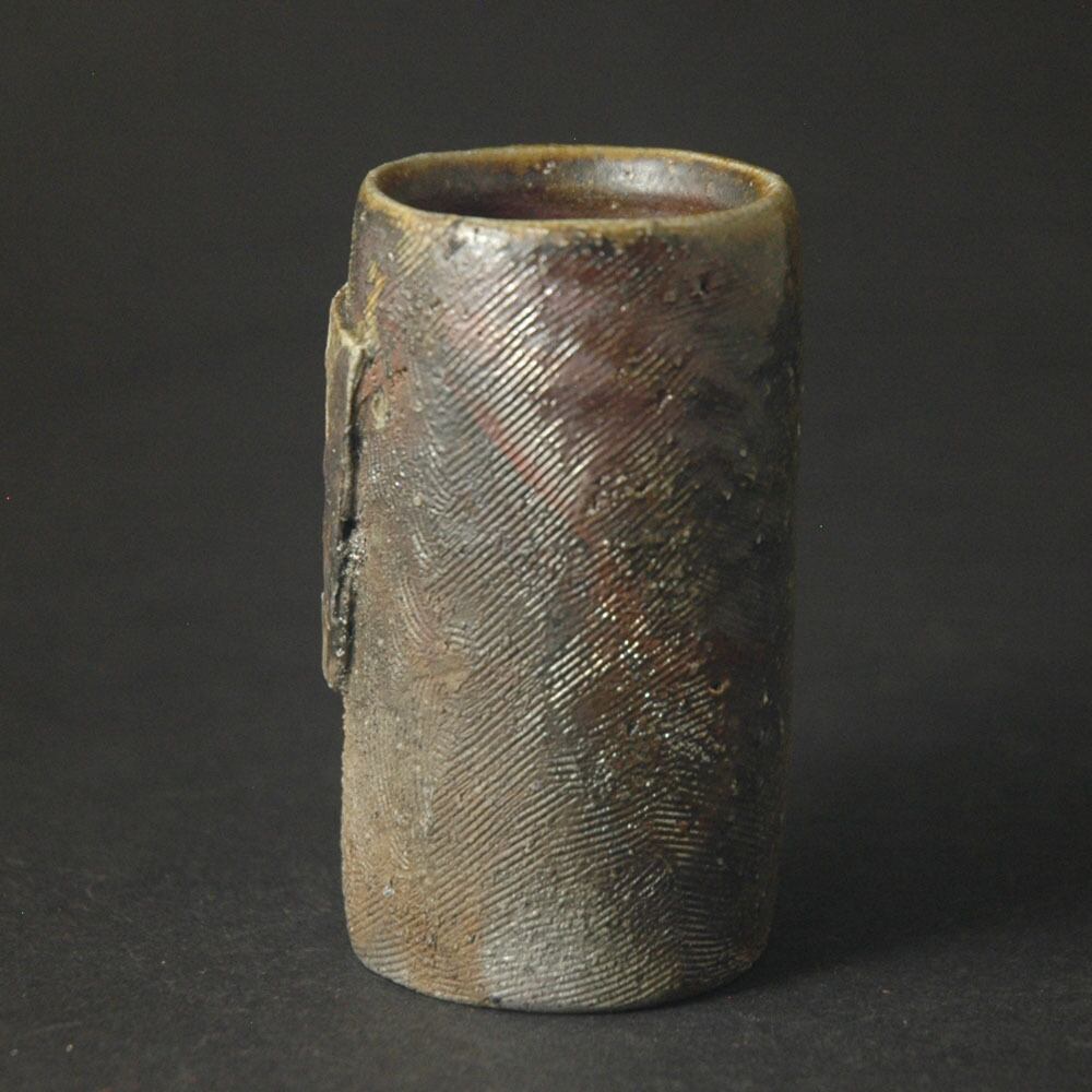 ロクロ成形後、表面を櫛目で整え、原土仕立てのレリーフを張り付けて加飾された筒酒呑(ぐい呑み)。