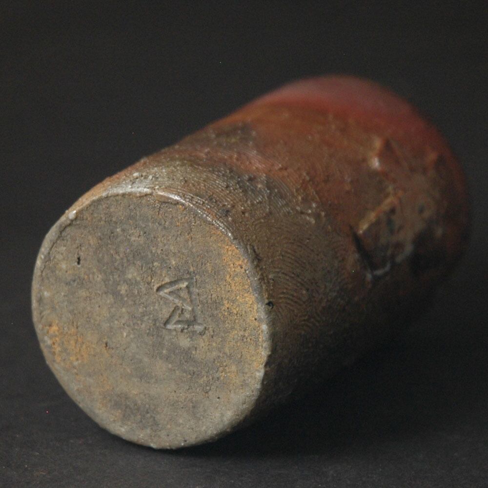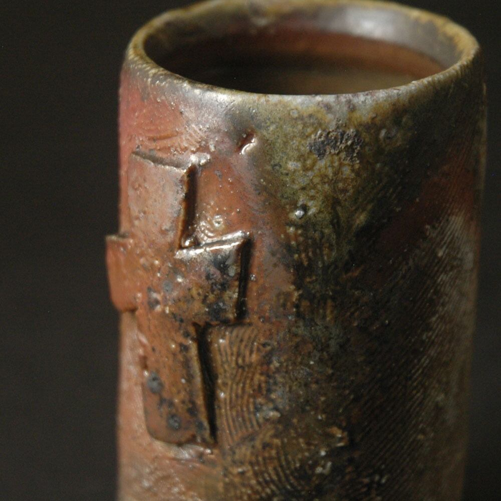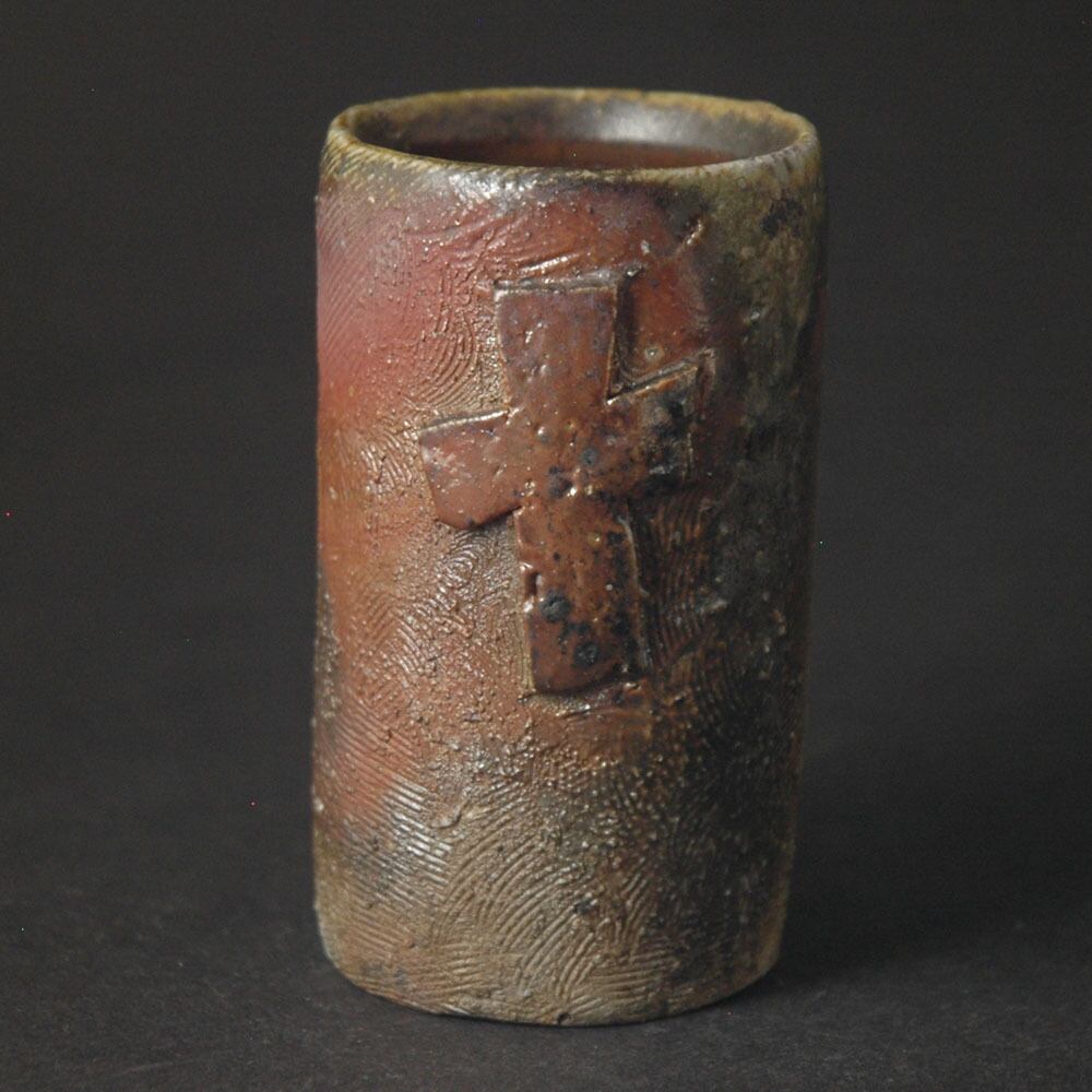 ロクロ成形後、表面を櫛目で整え、原土仕立ての十字のレリーフを張り付けて加飾された筒酒呑(ぐい呑み)。
