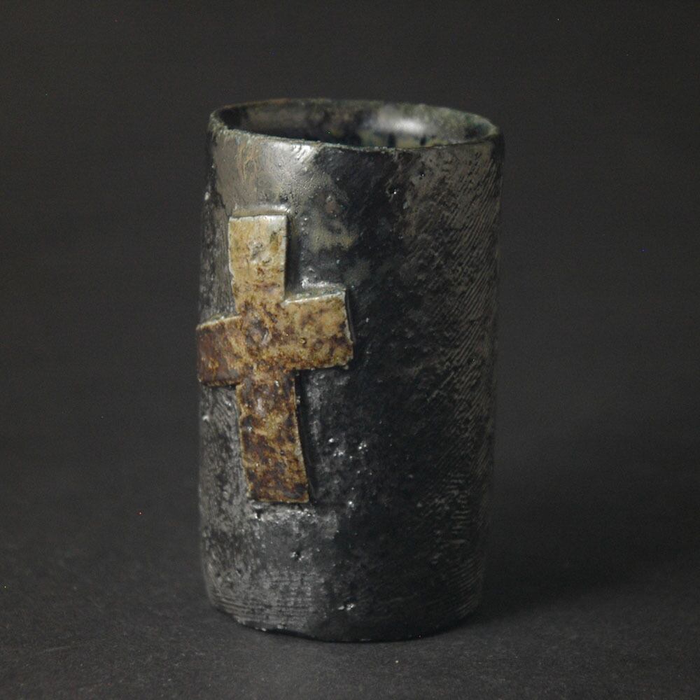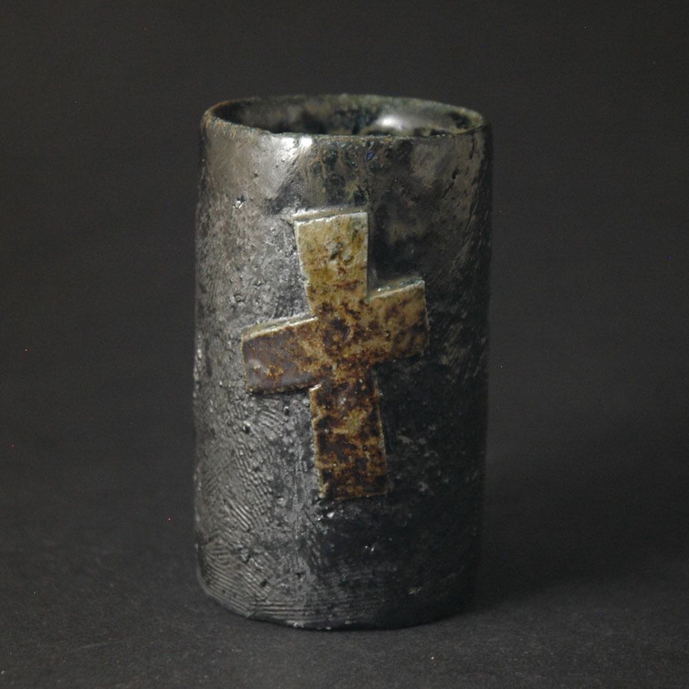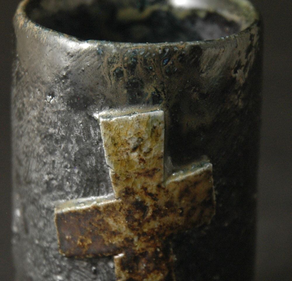 ロクロ成形後、表面を櫛目で整え、原土仕立てのトライアングルレリーフを張り付けて加飾された筒酒呑(ぐい呑み)。