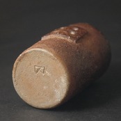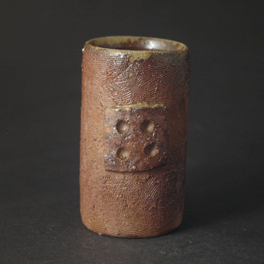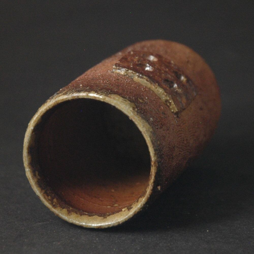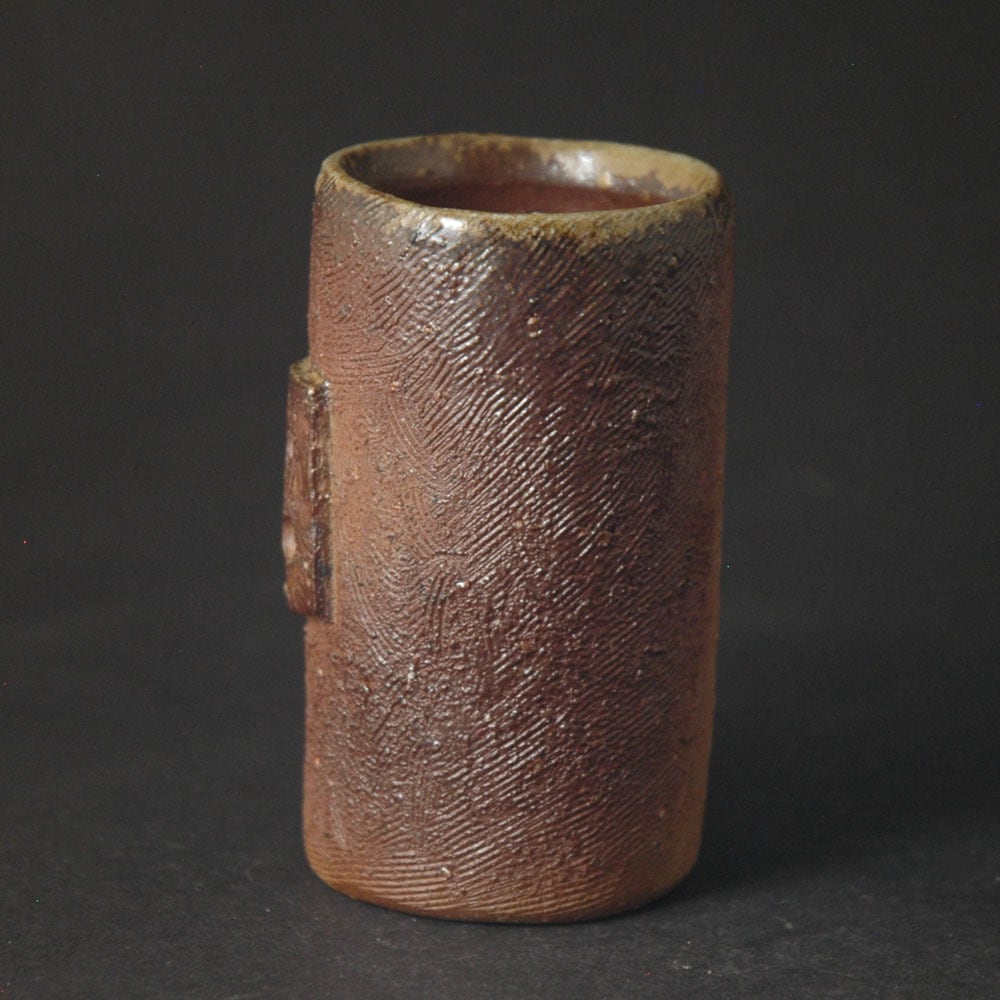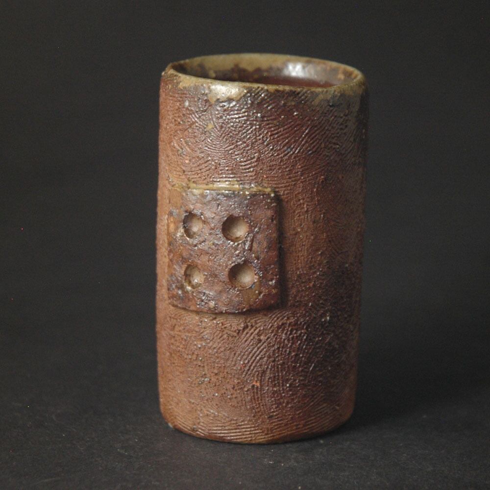 ロクロ成形後、表面を櫛目で整え、原土仕立てのスクエアのレリーフを張り付けて加飾された筒酒呑(ぐい呑み)。