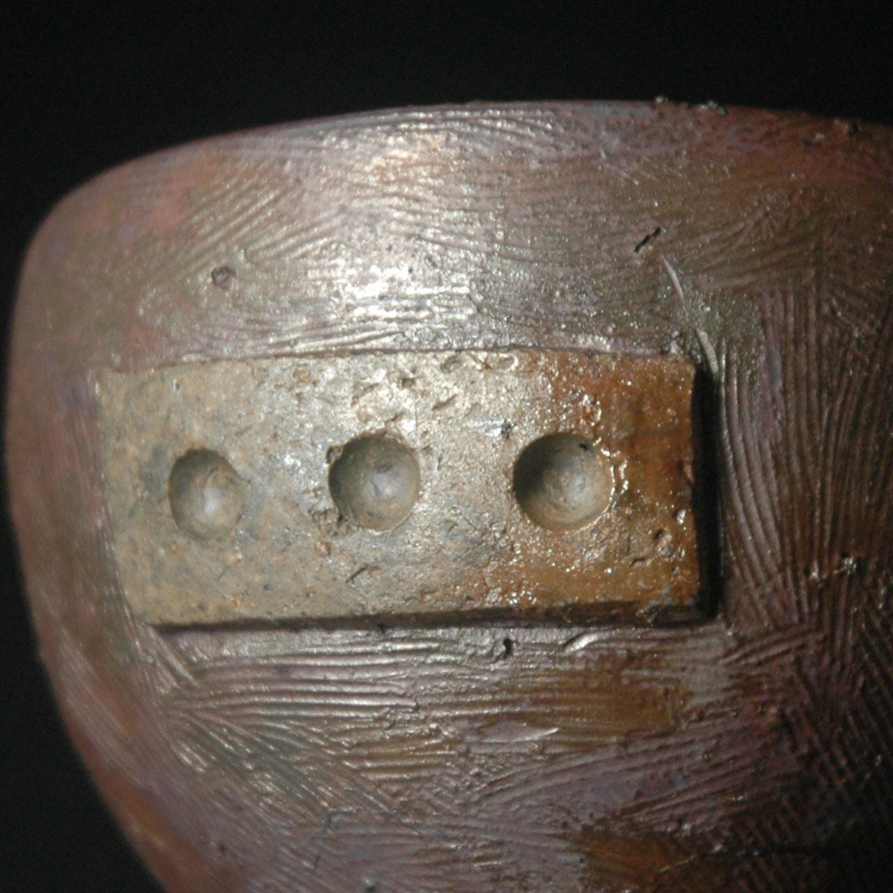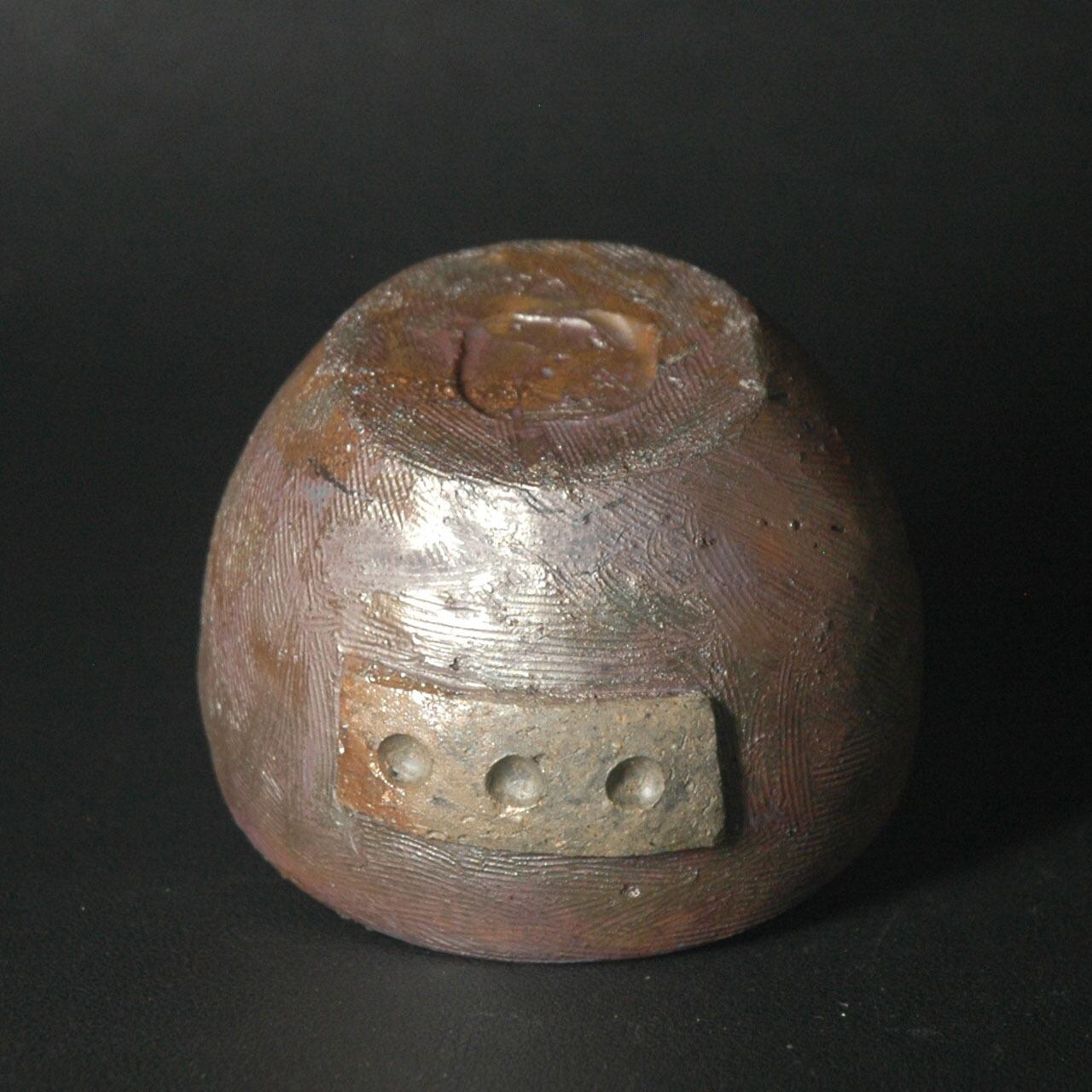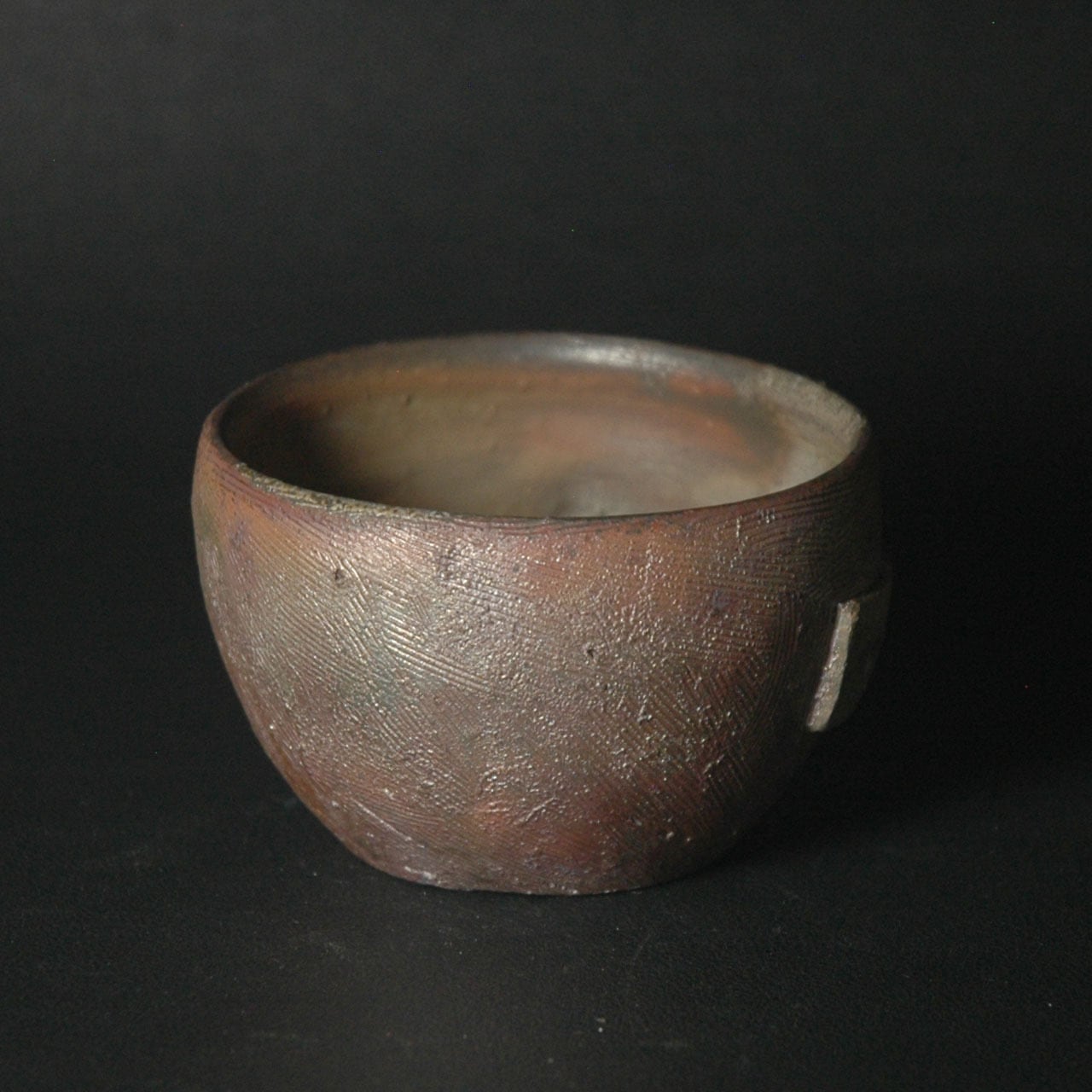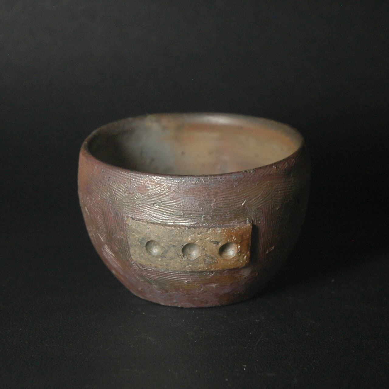 ロクロ成形後、表面を櫛目で整え、原土のレリーフを張り付けて加飾された丸い酒呑(ぐい呑み)。