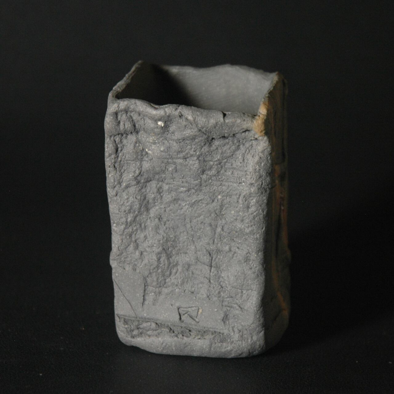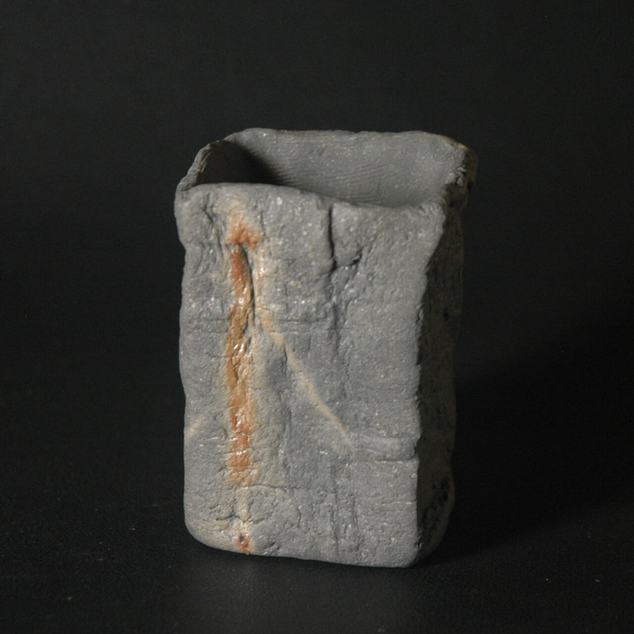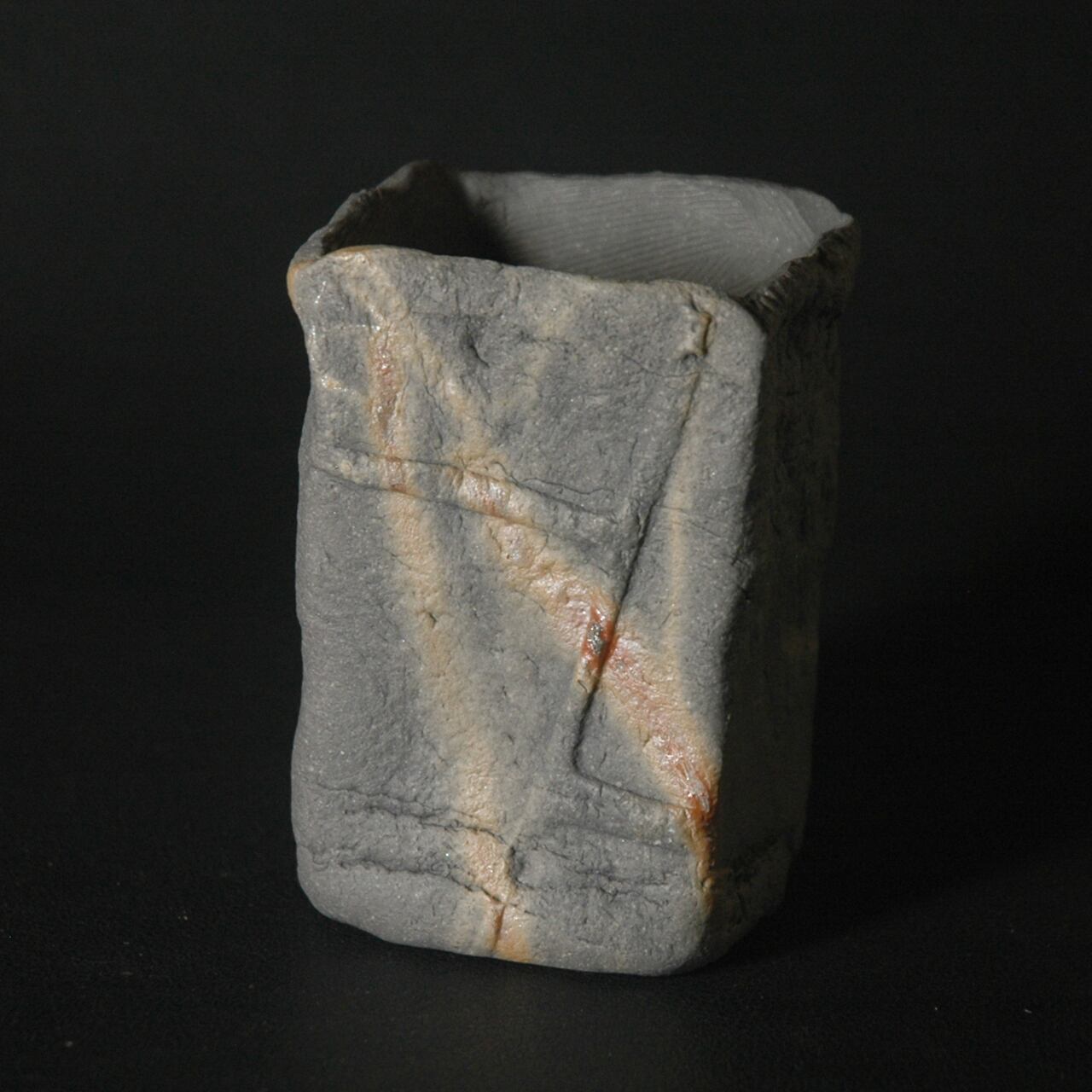 粘土を塊のまま成形し、表面を陽刻を施した後、中を刳り貫いて作られた酒呑(ぐい呑み)です。還元専用の角窯で焼成され、焼成完了時、作品の間に木炭を入れることで創り出される炭サンギリという窯変の一品。木炭から出るガスが炎の揺らぎのような模様など多彩な景色を創り出します。